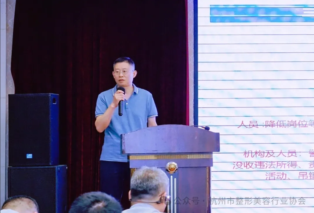会议上半场,浙江省整形美容质量控制中心主任严晟就《浙江省整形美容质控中心职能介绍与规范》进行解读,有助于大家更好地了解省级质控中心的运作机制和标准要求,为今后的工作提供借鉴和参考。随后,杭州市疾病预防控制中心(杭州市卫生监督所)四级调研员邢烨讲解《医美行业依法执业及经典案例》,作为医疗行业的从业者,我们必须时刻牢记依法执业的重要性。杭州市市场监督管理局医疗器械处吴梅副处长分享了《医疗器械在使用环节的监管要求》;杭州市市场监督管理局广告监督处毛洪处长带来了《医疗美容广告概述》。让我们共同学习、共同遵守,确保我们的工作始终在法律的框架内进行。